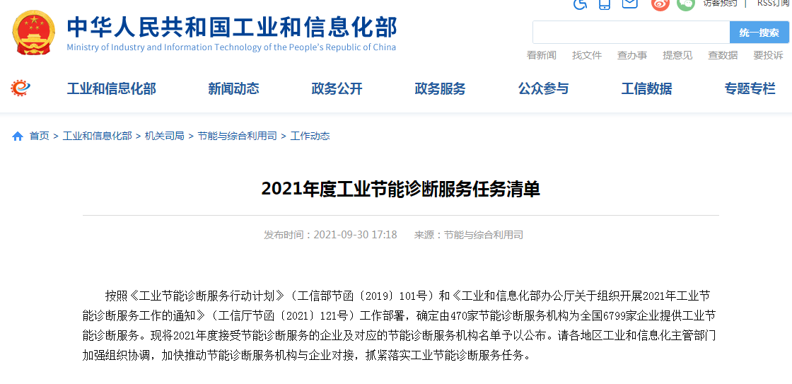 根據(jù)2021年9月30日,國家工業(yè)和信息化部《工業(yè)節(jié)能診斷服務行動計劃》(工信部節(jié)函〔2019〕101號)和《工業(yè)和信息化部辦公廳關于組織開展2021年工業(yè)節(jié)能診斷服務工作的通知》(工信廳節(jié)函﹝2021﹞121號)工作部署。
