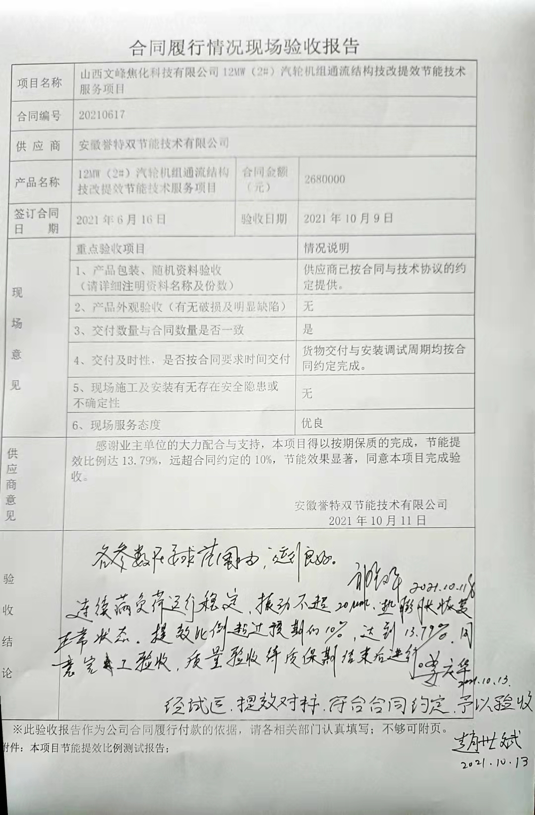 2021年10月13日,我公司技術(shù)服務(wù)項目——山西汾陽焦化12MW汽輪機組通流改造節(jié)能提效項目順利通過工程驗收,節(jié)能提效比例達13.79%,遠超合同約定的10%考核指標,在此表示熱烈祝賀。
