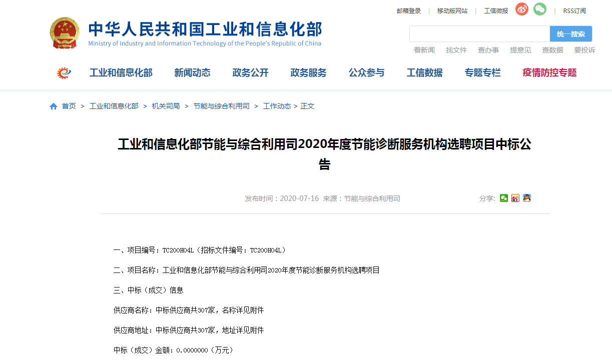 2020年7月15日,公司成功中標(biāo)工業(yè)和信息化部節(jié)能與綜合利用司“2020年度國家節(jié)能診斷服務(wù)機(jī)構(gòu)選聘項(xiàng)目合格供應(yīng)商”.
