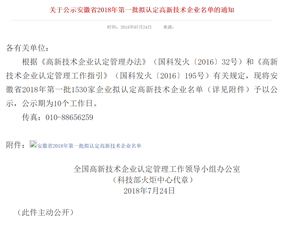 2018年7月24日,國家科技部全國高新技術企業(yè)認定管理工作領導小組辦公室,通過科技部火炬中心官網(wǎng)發(fā)布——安徽省2018年第一批國家級高新技術企業(yè)認定名單的公示通知,我公司安徽譽特雙節(jié)能技術有限公司榜上有名,目前已順利通過公示,正式予以認定,公司在此表示熱烈祝賀!