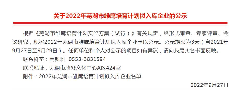 近日,經(jīng)市科技局統(tǒng)一組織申報(bào)、形式審查、專家評(píng)審、會(huì)議研究通過(guò),公布2022年度蕪湖市雛鷹培育計(jì)劃入庫(kù)名單,我公司喜獲認(rèn)定。