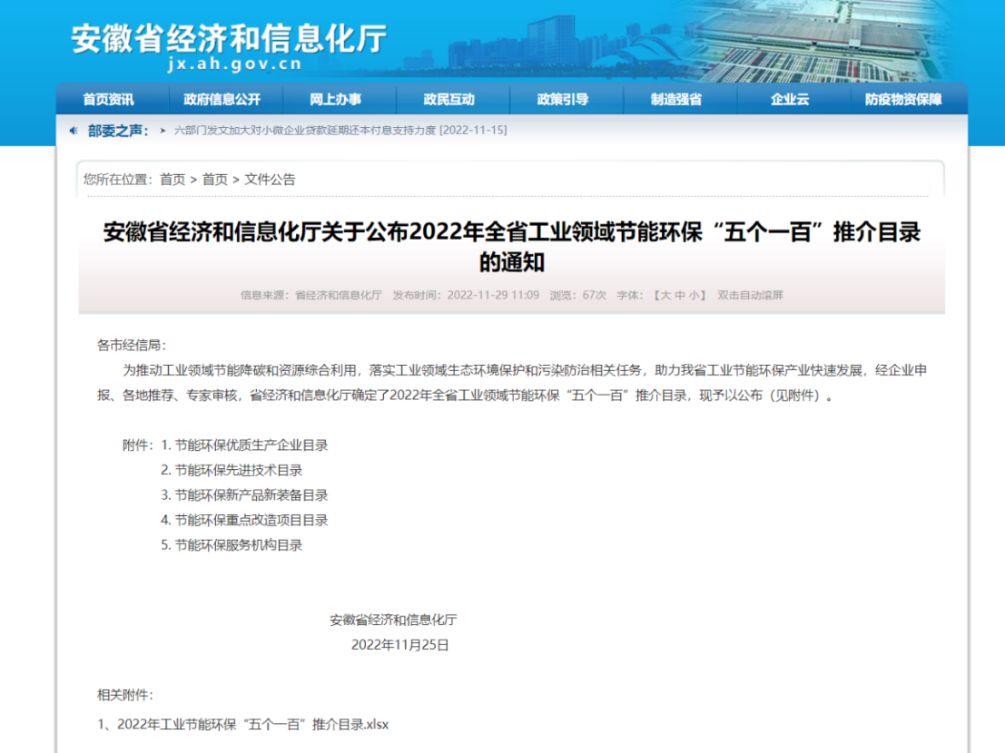 2022年11月25日,安徽省經(jīng)信廳發(fā)布2022年度全省工業(yè)領(lǐng)域節(jié)能環(huán)保產(chǎn)業(yè)“五個一百”推介目錄,我公司三個項目喜獲認定。