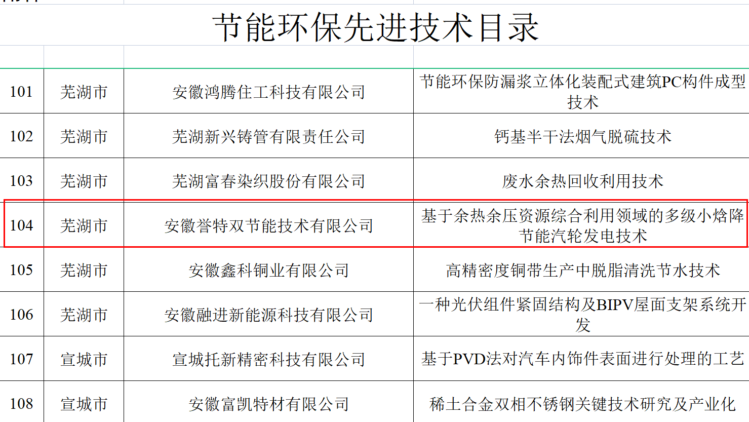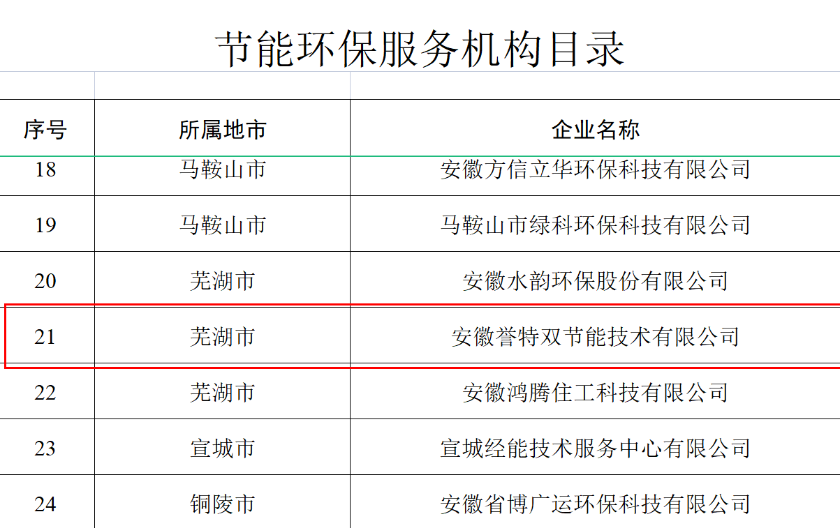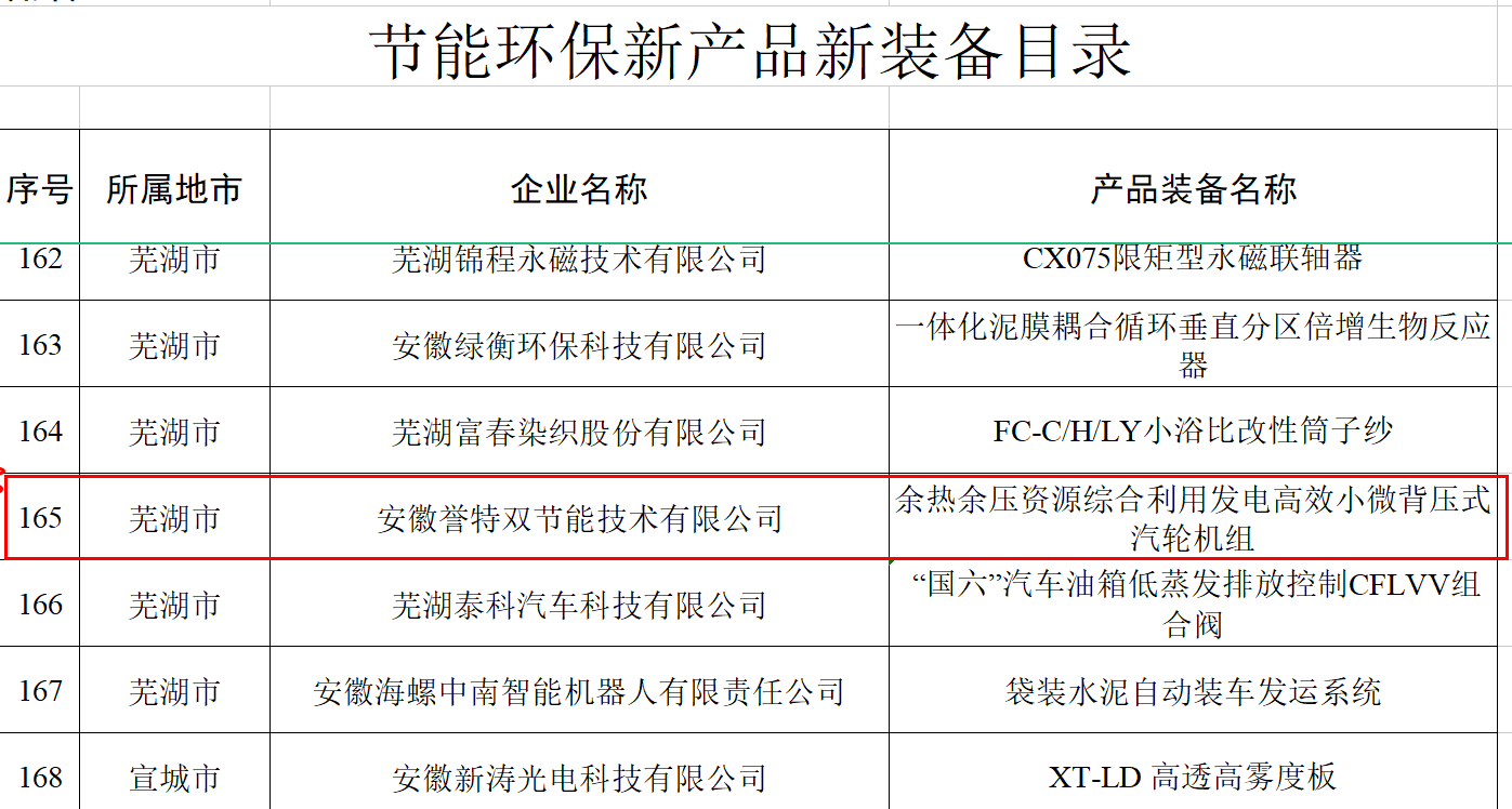 我安徽譽特雙節(jié)能技術(shù)有限公司入選省“節(jié)能環(huán)保服務(wù)機構(gòu)目錄”、核心產(chǎn)品“余熱余壓資源綜合利用發(fā)電高效小微背壓式汽輪機組”入選節(jié)能環(huán)保新產(chǎn)品新裝備目錄、核心技術(shù)“余熱余壓資源綜合利用領(lǐng)域節(jié)能汽輪發(fā)電技術(shù)”入選節(jié)能環(huán)保先進技術(shù)目錄。其中,節(jié)能環(huán)保服務(wù)機構(gòu)目錄名單,安徽省全行業(yè)領(lǐng)域共29戶,蕪湖市僅3戶,我公司榮登榜單,此次入選,為公司連續(xù)五年入選,在此表示熱烈祝賀。