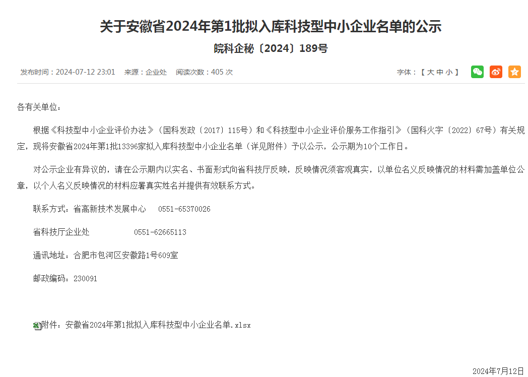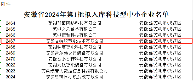 近日,根據(jù)《工業(yè)和信息化部辦公廳關(guān)于開(kāi)展2024年度科技型中小企業(yè)評(píng)價(jià)工作的通知》(工信廳企業(yè)函﹝2024﹞244號(hào))要求,通過(guò)企業(yè)評(píng)價(jià)、政府科技部門逐層審核,安徽省科學(xué)技術(shù)廳最終發(fā)布2024年第1批入庫(kù)科技型中小企業(yè)名單,我公司榮列榜單,在此表示祝賀。