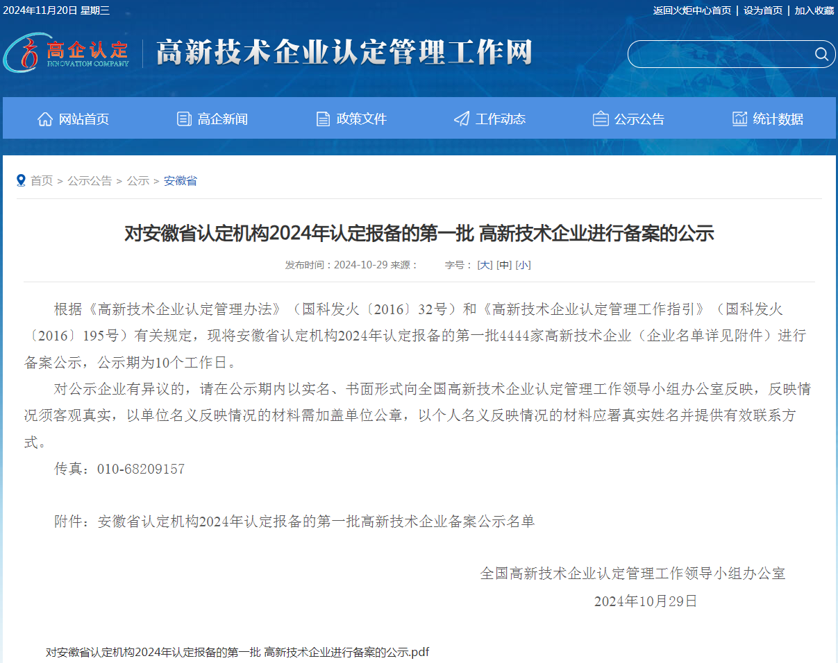 近期,全國高新技術(shù)企業(yè)認(rèn)定管理工作領(lǐng)導(dǎo)小組辦公室公布了安徽省2024年認(rèn)定報(bào)備的第一批高新技術(shù)企業(yè),我公司名列其中,在此表示祝賀!同時(shí)這也是公司連續(xù)第三次被認(rèn)定為國家高新技術(shù)企業(yè)。