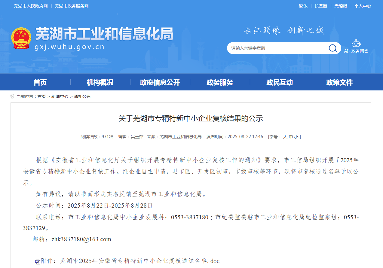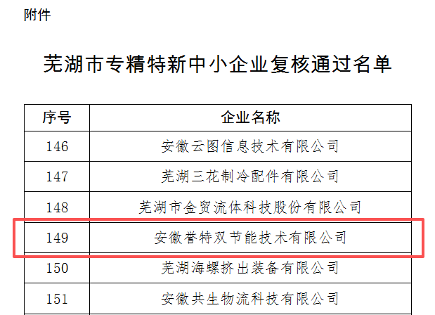 近日,蕪湖市工業(yè)和信息化局公布了“2025年專精特新中小企業(yè)”復核結果,我公司憑借持續(xù)的技術創(chuàng)新能力、扎實的產業(yè)深耕基礎和優(yōu)異的綜合實力表現(xiàn),順利通過復核,繼續(xù)獲評“蕪湖市專精特新中小企業(yè)”榮譽稱號。